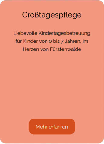 - Eine enge Zusammenarbeit mit der ersten Großtagespflege (direkt gegenübergelegen) sowie die fachliche Weiterentwicklung nach Maßgaben des Bildungsplans